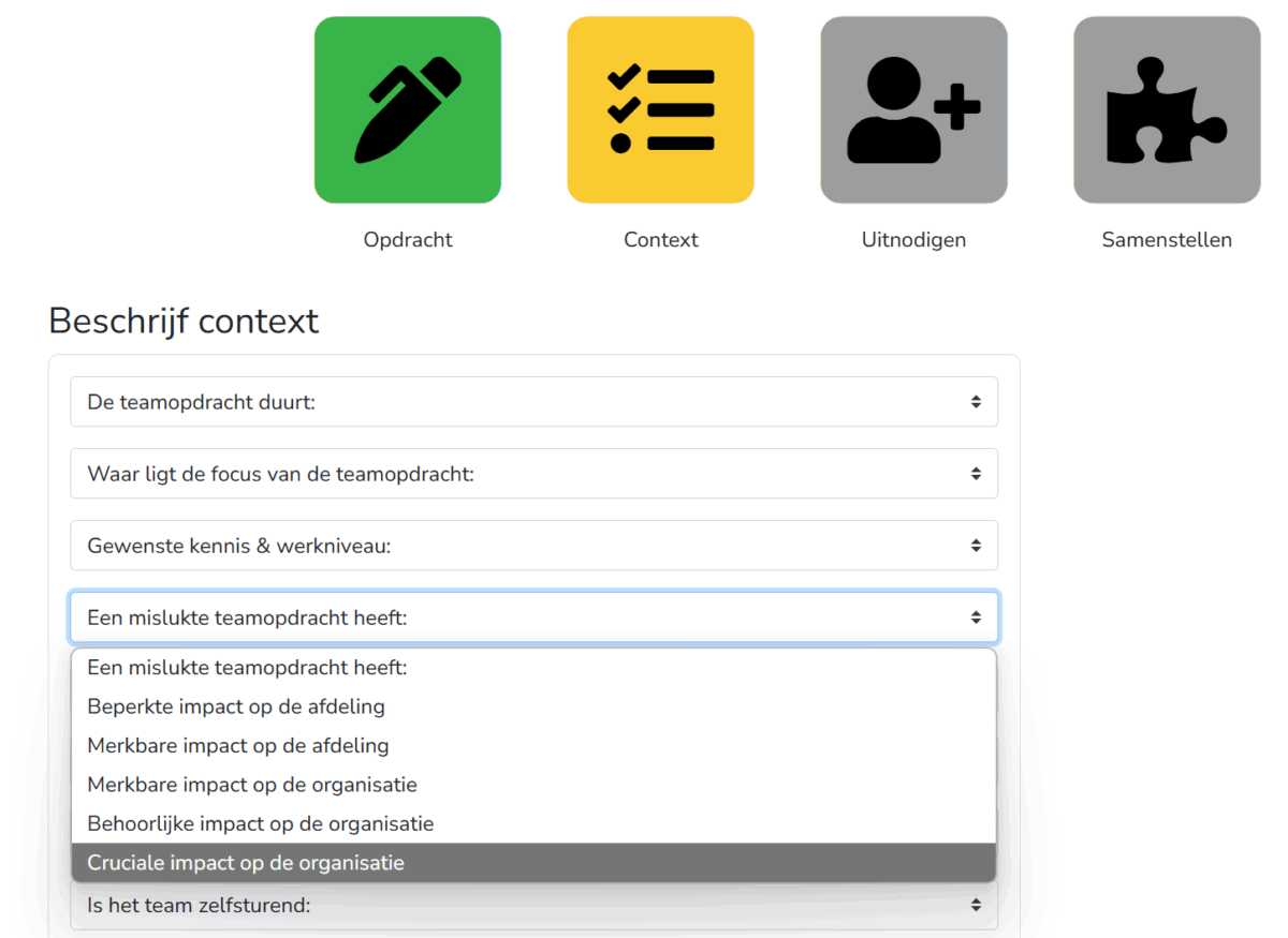 Het succes van een team is mede afhankelijk van de teamopdracht. Met Team-composer kun je de risico’s van een teamopdracht vooraf in kaart brengen. Hierdoor kun je tijdig wijzigingen aanbrengen zodat het team onder de juiste omstandigheden aan de opdracht kan beginnen.